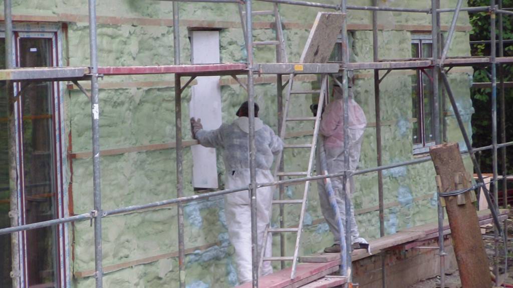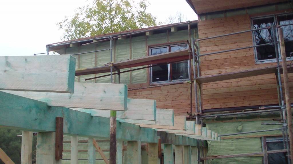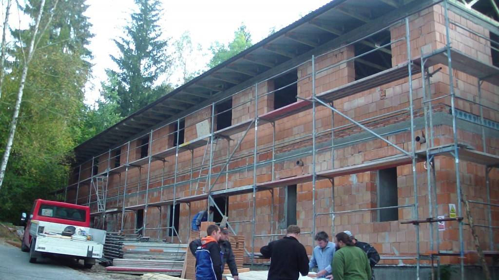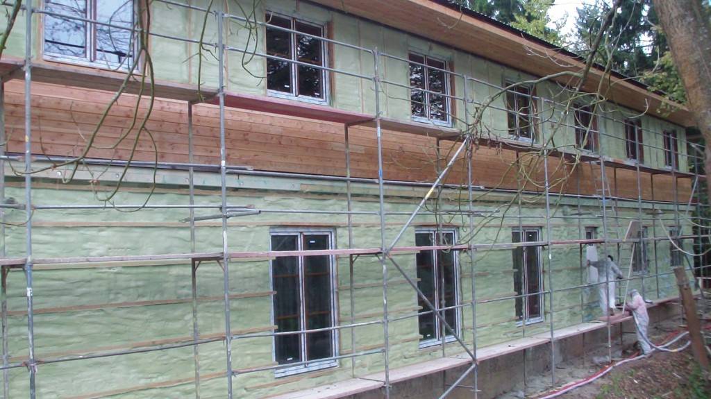 Zateplení fasády v BušínověOdvětrávaná fasáda školící středisko Bušínov – tepelná izolace izolační pěnou, záklop z modřínových desek. Fotografie